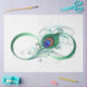The symbol of infinity with a bright, green, artistic peacock feather on a white background. Tattoo style.