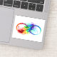 Artistically drawn infinity symbol with beautiful rainbow feather on white background. Tattoo style.