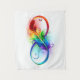 Artistically drawn infinity symbol with beautiful rainbow feather on white background. Tattoo style.