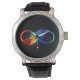 Artistically drawn infinity symbol with beautiful rainbow feather on white background. Tattoo style.