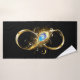 Gold, shiny symbol of infinity, decorated with jewellery peacock feather with turquoise on black background.