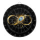 Gold, shiny symbol of infinity, decorated with jewellery peacock feather with turquoise on black background.