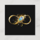 Gold, shiny symbol of infinity, decorated with jewellery peacock feather with turquoise on black background.
