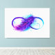 Infinity symbol with a beautiful feather painted in purple and blue bright colors on white background.