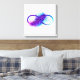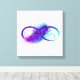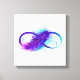 Infinity symbol with a beautiful feather painted in purple and blue bright colours on white background.