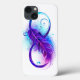 Infinity symbol with a beautiful feather painted in purple and blue bright colours on white background.