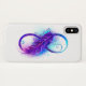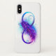 Infinity symbol with a beautiful feather painted in purple and blue bright colours on white background.