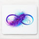 Infinity symbol with a beautiful feather painted in purple and blue bright colours on white background.