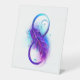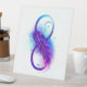 Infinity symbol with a beautiful feather painted in purple and blue bright colours on white background.