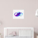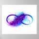 Infinity symbol with a beautiful feather painted in purple and blue bright colours on white background.
