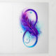 Infinity symbol with a beautiful feather painted in purple and blue bright colors on white background.
