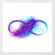 Infinity symbol with a beautiful feather painted in purple and blue bright colours on white background.