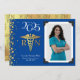 Célébrez le nouveau diplômé de l'école de sciences infirmières avec ce faire-part de diplôme en or et bleu RN caduceus! Elégant avec une bordure photo vintage et des accents de confettis dorés ! Parfait pour toute personne diplômée en tant qu'infirmière avec son baccalauréat en sciences infirmières!