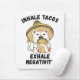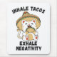 Cute design that shows a lovely cartoon cat wearing a sombrero hat and eating a mexican taco with the funny quote "Inhale tacos, exhale negativity. Tasty food makes you happy.
