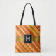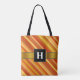 This tote bag design features a striped pattern inspired by the shades of colours like red, yellow, orange, and beige that can be seen on some goldfish. It also features a personalized initial letter in white coloured text within a dark square shaped area on a faux gold coloured band. [~Z0000050]