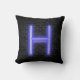 Initial H in glowing marquee purple neon lighting on urban city brick wall.