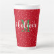 Red with white stars background, white "i believe" and large Christmas green monogram, decorate this 17oz. stylish latte mug. Easily change or remove text and initial using the Template provided. Available in 12oz or 17oz size. Use for any beverage. Makes a lasting and thoughtful gift for a special person. See "About This Product" at side for more information.