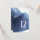 An abstract background reminiscent of liquid ink in shades from deep navy blue through cyan and white is the backdrop for elegant handwritten script text and modern design layouts in the pieces of this beautiful wedding suite. The wedding table number card shown here features the above and a template to add your own pertinent event information. Search ID762 to see all the coordinating pieces in this set.