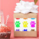 A colourful pattern of dog paw prints with ink splatter effect.