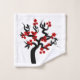 Cerisier sakura inséparables rouge et noir avec serviette de bain fleurie. Il comprend un sakura noir avec des fleurs rouges avec un coeur noir au centre et une paire d'inséparables. Votre nom est écrit dans une police de style script.