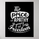 An inspirational quote about apathy and the loss of our freedoms in white lettering displayed in an artistic typographical layout on a pure black background which you can customize to the colour of your choice.