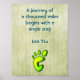 Inspirational quote from Taoist philosopher and sage, Lau Tzu which reads: "a journey of a thousand miles begins with a single step.". Includes an image of a cool footprint in lime green with a drop shadow. The background is a faded striped vintage texture.