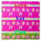 Light Blue/Cyan: Used for the text "LOVE," "EAT," and "PLAY," ensuring clear visibility and contrast against the backgrounds.