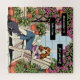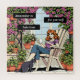 A fun comic book illustration of a woman sitting on her lawn chair on her patio, with her cat, a cup of coffee or tea and surrounded by purple clematis and hanging plants.