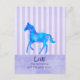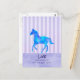 A postcard with an inspirational quote with a horsey theme. The quote says Live like someone left the gate open. With an image of a watercolor horse running free. Painted in blue and purple watercolors. The background is vintage purple stripes with a purple watercolor border.