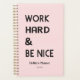 Inspirational Success Quote Work Hard Be Nice pastel pink planner. Use personalize this template option to change the text | Use customize further option to change the background colour, text style and colour if required.
