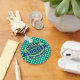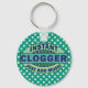 "Instant Clogger: Just Add Music." This cute keychain design for clog dancers features an oval-shaped banner in shades of green, blue and white with music notes and stripes. The background is blue-green with white polka dots. It's a pretty key chain for the clog dancing fan. See variations and more original clogging designs at our ClogDance shop link!