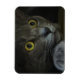 A close-up shot of the face of a grey cat with yellow eyes and dilated pupils, resting his head on his paw and staring intently at something behind the camera.
