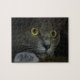 A close-up shot of the face of a grey cat with yellow eyes and dilated pupils, resting his head on his paw and staring intently at something behind the camera.