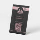 This design incorporates a minimalist flat logo in a rose steel metal finish, embodying the principles of architecture and interior design. The designer or company name is elegantly presented in a modern script font, projecting a chic and sophisticated brand identity. Essential information is conveyed using a delicate minimalist serif typeface. They are featured on a metallic band on the top. Functionality is enhanced on the bottom with a customizable QR code, allowing for direct access to a specified online destination (such as a website, Instagram account, or portfolio).