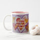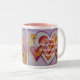 Watercolor painting of hearts interlocking with each other like love from life relationships. The colours are a soft lavender purple, pinks, red, yellows, and gold. This image is meant is a tribute to all those we love in our life. The interlocking love heart connections hold us together in joy and celebrations. It is love too for strengthening our souls for life's challenges. Personalize the heart mug with your own text and images using the Customize It option. Make special Valentine's Day, Wedding, Engagement, Baby, or Love custom mug gifts! Profits from this sale support the non-profit 501(c)3 DonnaBellas Angels.