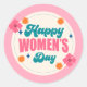 International women's day trendy girly cute round sticker. Retro colourful typography and font sticker to celebrate women's day in the world, equity, progress for women . Gift idea for women, girls, teens, aduls, wifes, lady boss. Pink cute sticker for notebook, packaging, school, work, organisation.