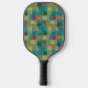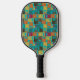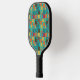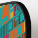 This pickleball paddle has a mid-century modern design of rounded rectangles, in gold, orange, brown, deep red, and dark teal, with holes and thin white lines on top of them, “interrupting” the rectangles. If you like the design but prefer different colours, message me.