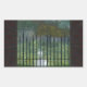 A 3D landscape in early autumn, depicting a path wandering up through the grass into a misty forest of old and gnarled trees. But the overgrown pathway is barred by a gate of black iron spikes between dark brick walls. Created in Vue.