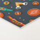 Intricate geometric pattern featuring vibrant orange, blue, and yellow shapes on a dark background. The design is symmetrical and rich in detail.