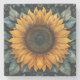An artistic depiction of a large sunflower with detailed petals on a decorative dark background filled with leaves.