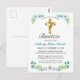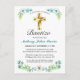 Celebre el bautismo de su hijo con amigos y familiares invitándolos con esta elegante postcard de invitación de bautismo floral de oro y verde azulado. Este diseño presenta una hermosa cruz de oro con un marco floral sobre un fondo blanco simple. Personaliza el texto y la fuente a tu gusto. Otras fuentes y estilos disponibles. Contáctanos con tus solicitudes especiales y estaremos encantados de ayudarte.