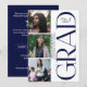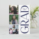 Modern and elegant graduation announcement featuring a clean, minimalist layout with a soft neutral background. The design highlights three photo panels showcasing the graduate in candid and portrait-style moments, creating a personal feel. A bold vertical “GRAD” typography element adds a contemporary touch, while within the letter day displays “Class of 2026” for a polished finish. The graduate’s name and school are presented in a sleek, vertical format, making this invitation perfect for showcasing achievements with style and sophistication. The back includes the details of the celebration and the RSVP response details.