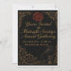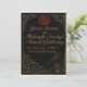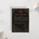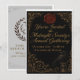 A gothic invitation on textured black, adorned with antique gold Victorian borders. The front features a crimson wax seal, gold calligraphy, and a raven perched on an hourglass.