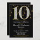 Une élégante invitation de fête de 10e anniversaire en noir et or, avec un grand 10 avec des diamants et une apparence dorée ainsi qu'un rideau scintillant de lumières dorées.