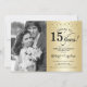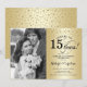 Invitation pour le 15e anniversaire de mariage avec photo. Design élégant en or avec police de caractères script et confettis. Peut être personnalisé pour afficher n'importe quelle année de mariage. À 15 ans de mariage !