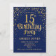 Invitation de fête du 15e anniversaire. Design élégant en bleu marine et faux parties scintillant or. Comprend des polices de caractères et des confettis stylisés. Message-moi si vous avez besoin d'âge personnalisé.