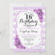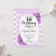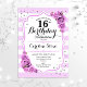 Invitation du 16e anniversaire. Design élégant de lavande blanche avec parties scintillant imitation. Comprend des rayures blanches avec des roses violets. Idéal pour une élégante fête du seizième anniversaire.