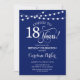 Invitation du 18e anniversaire. Simple design bleu marine et blanc avec des lumières à cordes féeriques et une police de script. Bravo à 18 ans ! Peut être personnalisé à tout âge! Message-moi si vous avez besoin d'une personnalisation plus poussée.