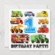 Neuf camions colorés entourent un grand nombre 1! Ajoutez votre âge ! Un mélangeur de ciment vert et jaune, un pick-up bleu, un bulldozer jaune, un camion à benne orange, un rouleau routier rouge, un tracteur vert et une remorque, un grand camion-feu rouge, un excavateur jaune et un camion rouge de constructeur! Toutes sortes de transports, les gros camions que les enfants aiment ! Idéal pour votre camion de pompier, de creveur, de camion ou de tracteur fou d'un an à son 1er anniversaire. Merveilleux pour la fête d'anniversaire à thème de votre enfant de 1 an. Les enfants adorent les camions, les camions, les camions et les camions et les enfants d'un an aiment surtout les camions!