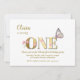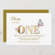 Une jolie invitation de 1er anniversaire en or avec texte or et le numéro UN en or métallique et décoré de fleurs roses, ainsi qu'un beau papillon rose pâle assis sur l'E.